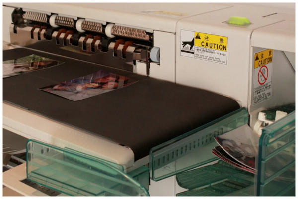 Наша лаборатория способна распечатать до 1700 фотографий в час, что позволяет выполнять огромное количества заказов в день. Процесс печати начинается с заправки кассет, в этих кассетах находится рулон фотобумаги длиной до 180 метров. Бумага нарезается под нужный формат специальными ножами внутри машины, с помощью вращающихся валиков фотография проходит через экспонирование лазером, далее она погружается в три химических раствора (отбелка, проявитель, стабилизатор). Изображение постепенно проявляется на бумаге, с нее смывается лишняя химия, происходит сушка. Весь этот процесс автоматизирован и проходит внутри светонепроницаемого корпуса печатной машины. Готовые фотографии, с помощью конвейерной ленты укладывается в лотки, что позволяет разделить заказы. Отпечатанные фотографии Вы получаете в конвертах или файлах.